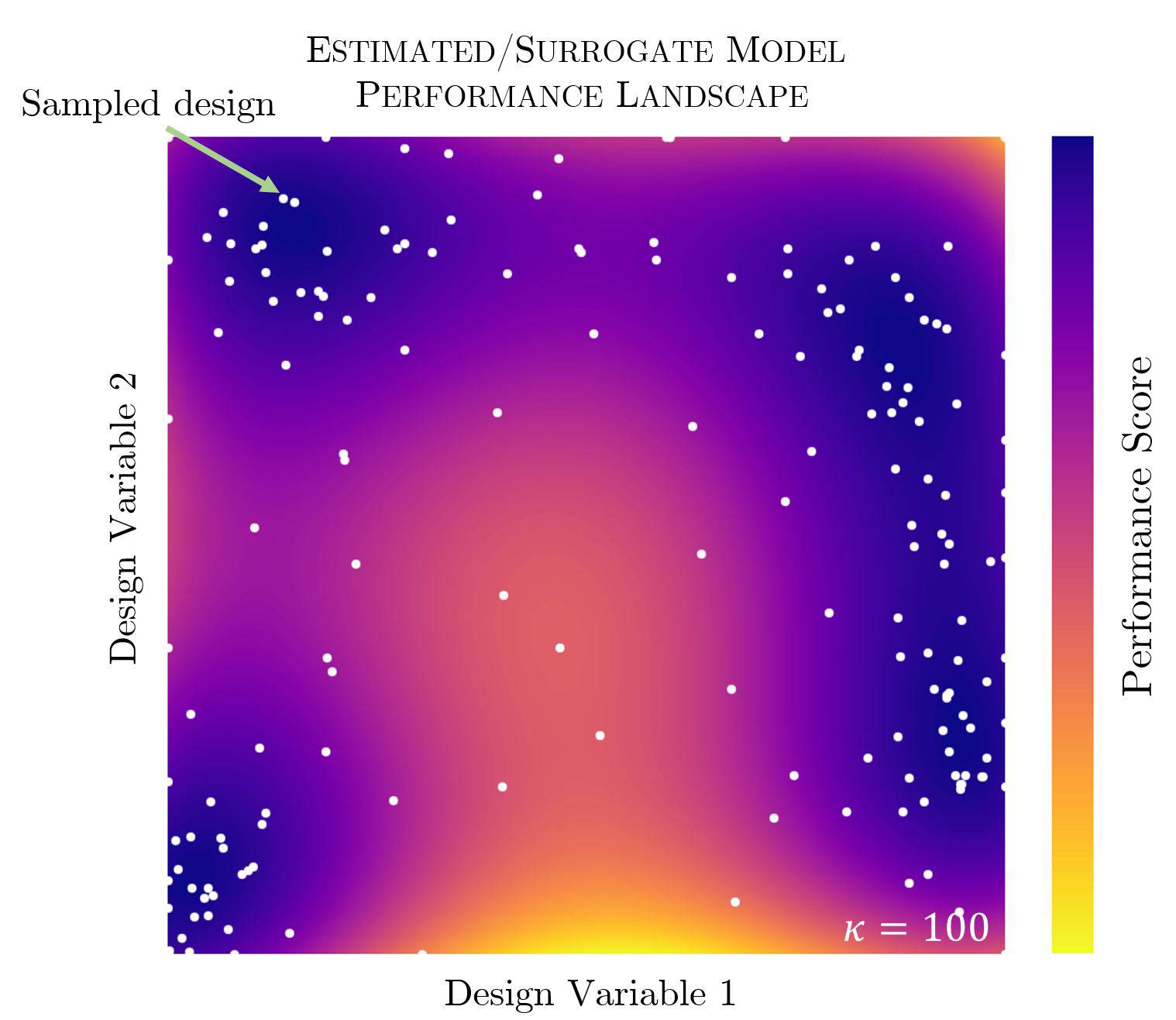 After training the surrogate model using bayesian optimization techniques, the performance landscape estimate enabled the algorithm to sample 28% more high-performance designs than the evolutionary algorithm.