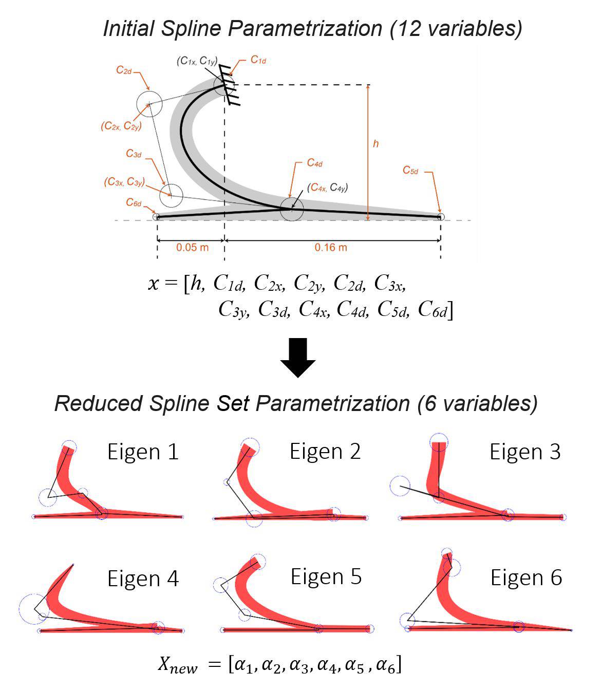 I used PCA to reduce the number of design variables for this prosthetic foot model from 12 to 6 while keeping 79.8% of the variance in high-performance design space regions. This reduction of parameters describing a prosthetic foot enabled a 5.4 time reduction in optimization time while achieving 94% of the optimal performance score. The process followed for this work was: