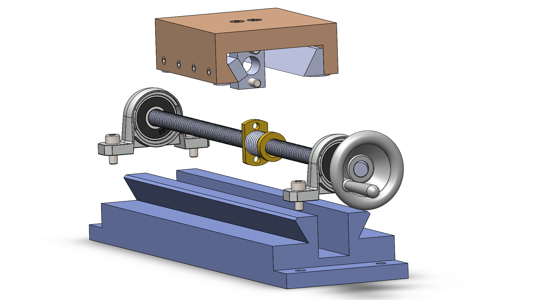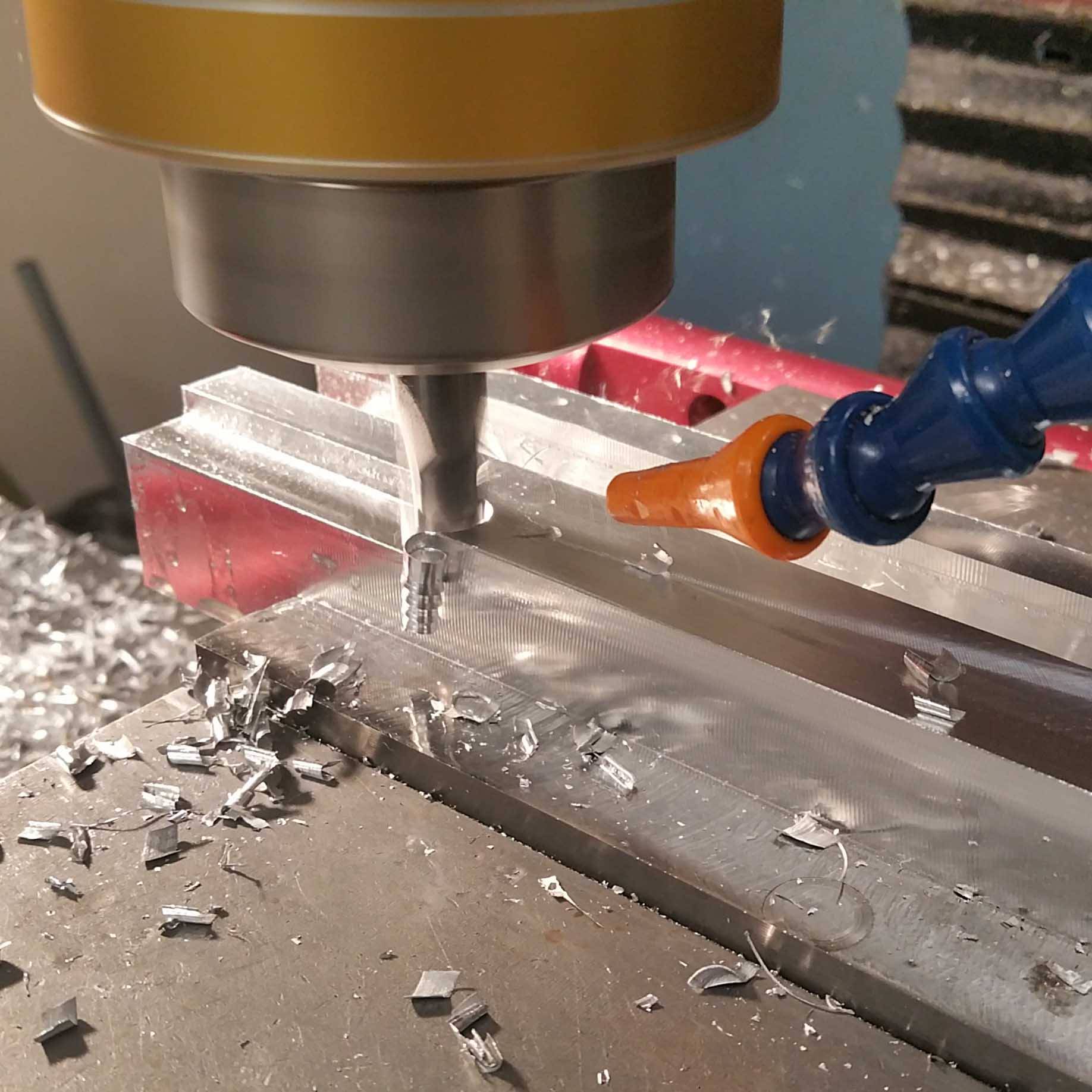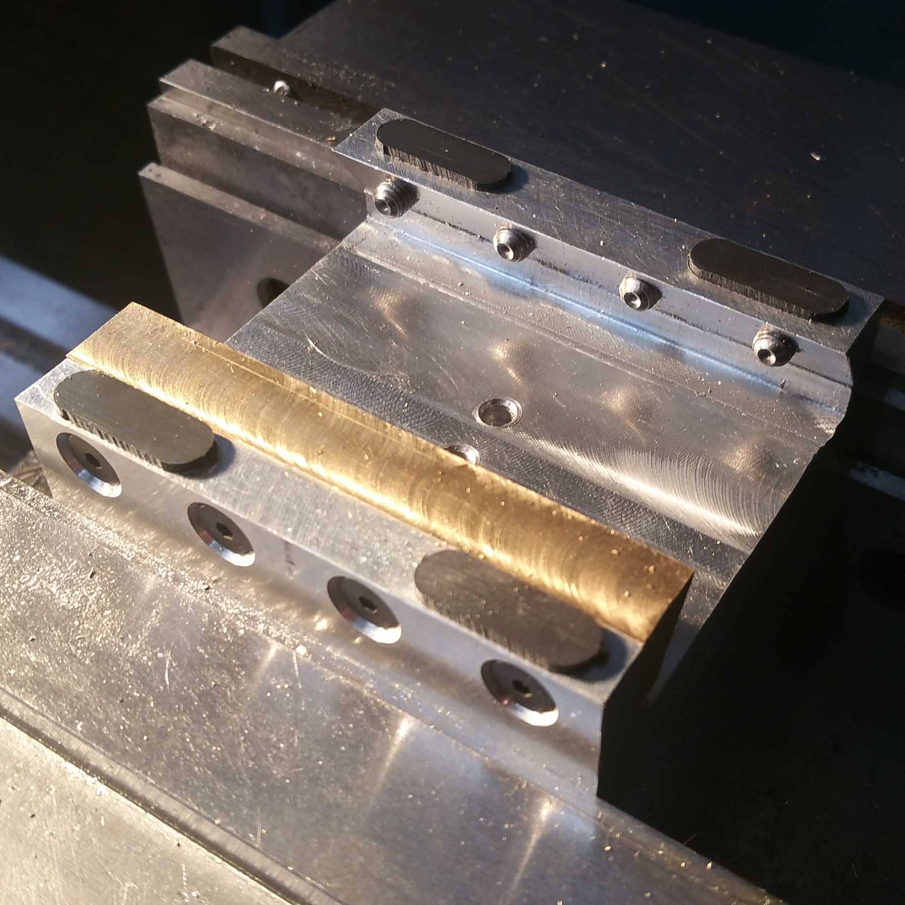Most of the fabrication was done using a mill. The carriage and the rail were made from aluminum stock, using a dovetail cutter. The gibs were made from brass stock. The teflon pads were made on the waterjet and press-fitted in the carriage. For the dovetail brass gib, I first made it using angle blocks but during assembly, there was an angular mismatch from the dovetail brass gib and the rail (line contact). To fix that mismatch, I fixtured the gib in the carriage and used the dovetail cutter to get the right angle. For the next iteration, I will definitely machine the dovetail gib having it bolted on the carriage.