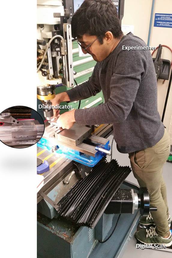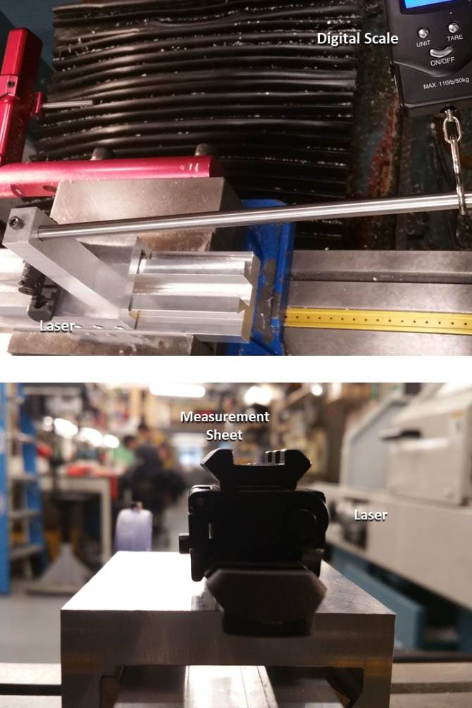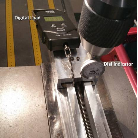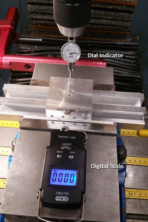 For the Y and Z stiffness the LMS was positioned on the mill and the deflection was measured using a dial indicator. For the Y stiffness a digital scale was used to load the LMS but for the vertical stiffness body weight was used to load the LMS and a weight scale was used to record the body weight load on the LMS.