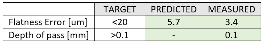 The predicted values were computed assuming an accuracy of 0.001” on the mill (flatness error). The manufactured LMS fulfilled the functional requirements in terms of geometric errors.