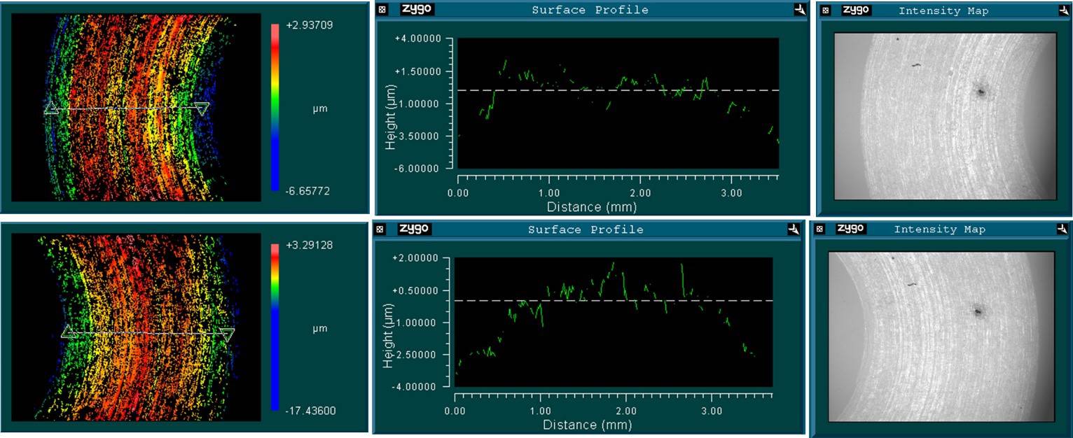 The flatness of the 0.1mm test cuts were then measured on a ZYGO white light interferometer, exhibiting a maximum height difference on the face of 3.4 ± 0.2 microns, and a misalignment between the two linear motion axes of 0.89 ± 0.05 mrad matching our design requirements and our predictions of 5.7 microns load induced errors.
