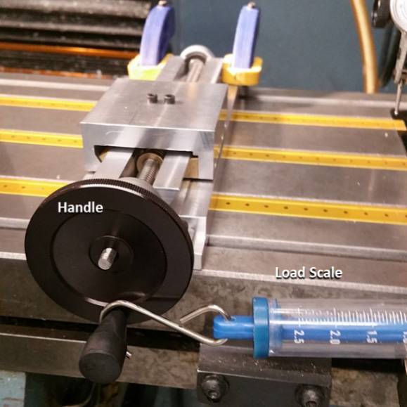 For this measurement, I used a digital load scale, a dial indicator (0.0002” resolution) with the assembly fixtured in the mill. The measured stiffness was 2.6 N/um which matches the predicted stiffness of 5.6 N/um.